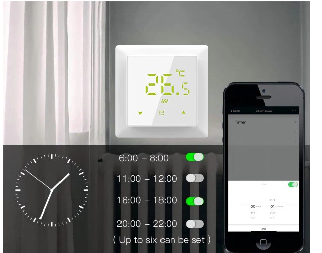 Controlează-ți încălzirea prin pardoseală prin aplicația Smart Life/Tuya sau prin asistenți vocali precum Alexa, Google Home. Preîncălzește camera înainte de a ajunge sau ajustează temperatura fără a te ridica de pe canapea. - Programare săptămânală flexibilă